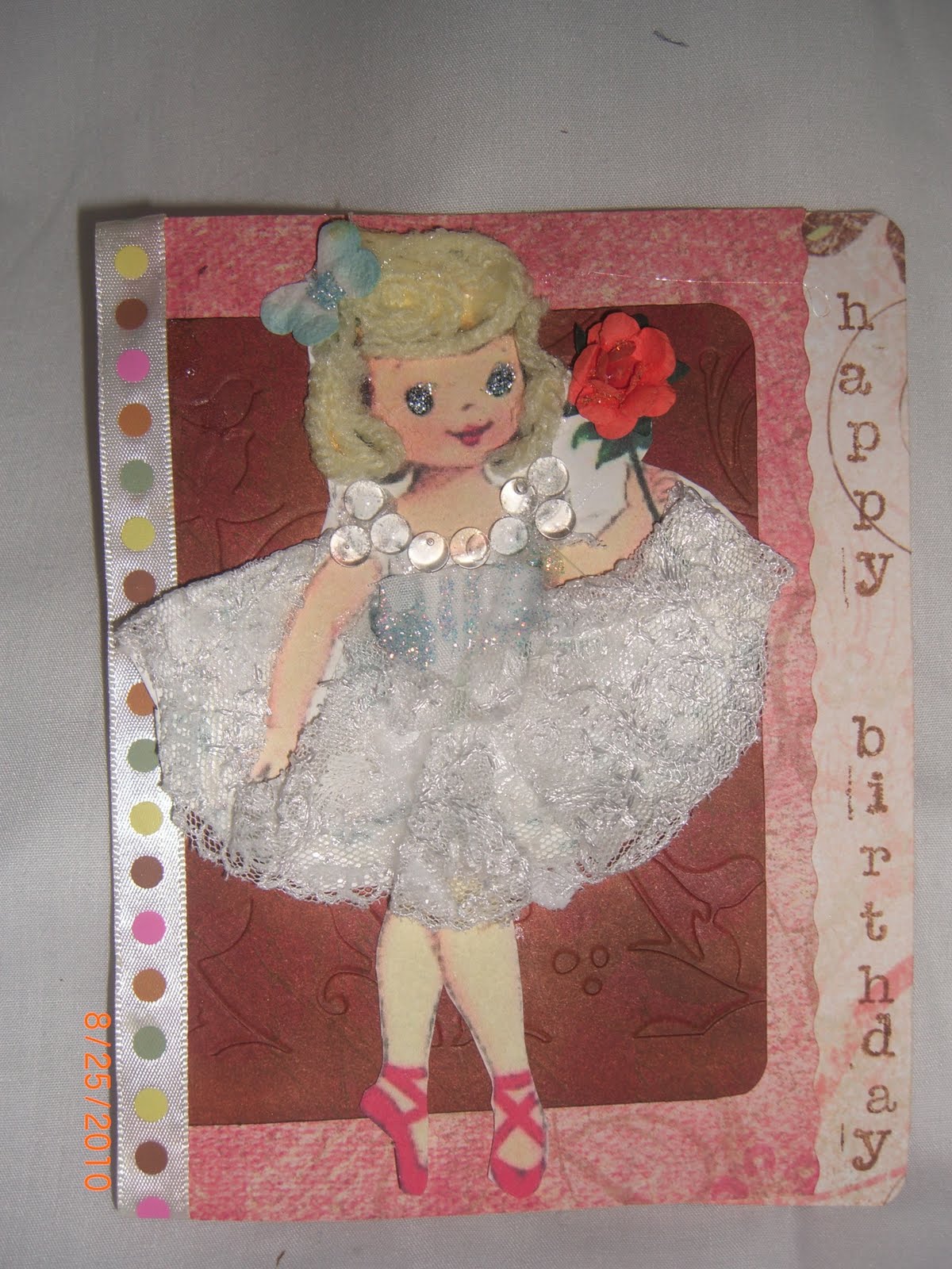 I used lace for her little dress, yarn for her hair, a 3d rose for her flower, added a little butterfly (part of a flower) dew drops thingies for her collar, distressed with tim holtz inks the background and debossed it and decided she would make a perfect birthday card for a little girl. I am actually entering my first challenge with Simon Says Challenge. Wish me luck.