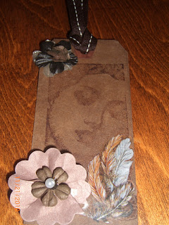 This is an walnut stained tag, with a stamped image, paper and silk flowers and a brown ribbon.