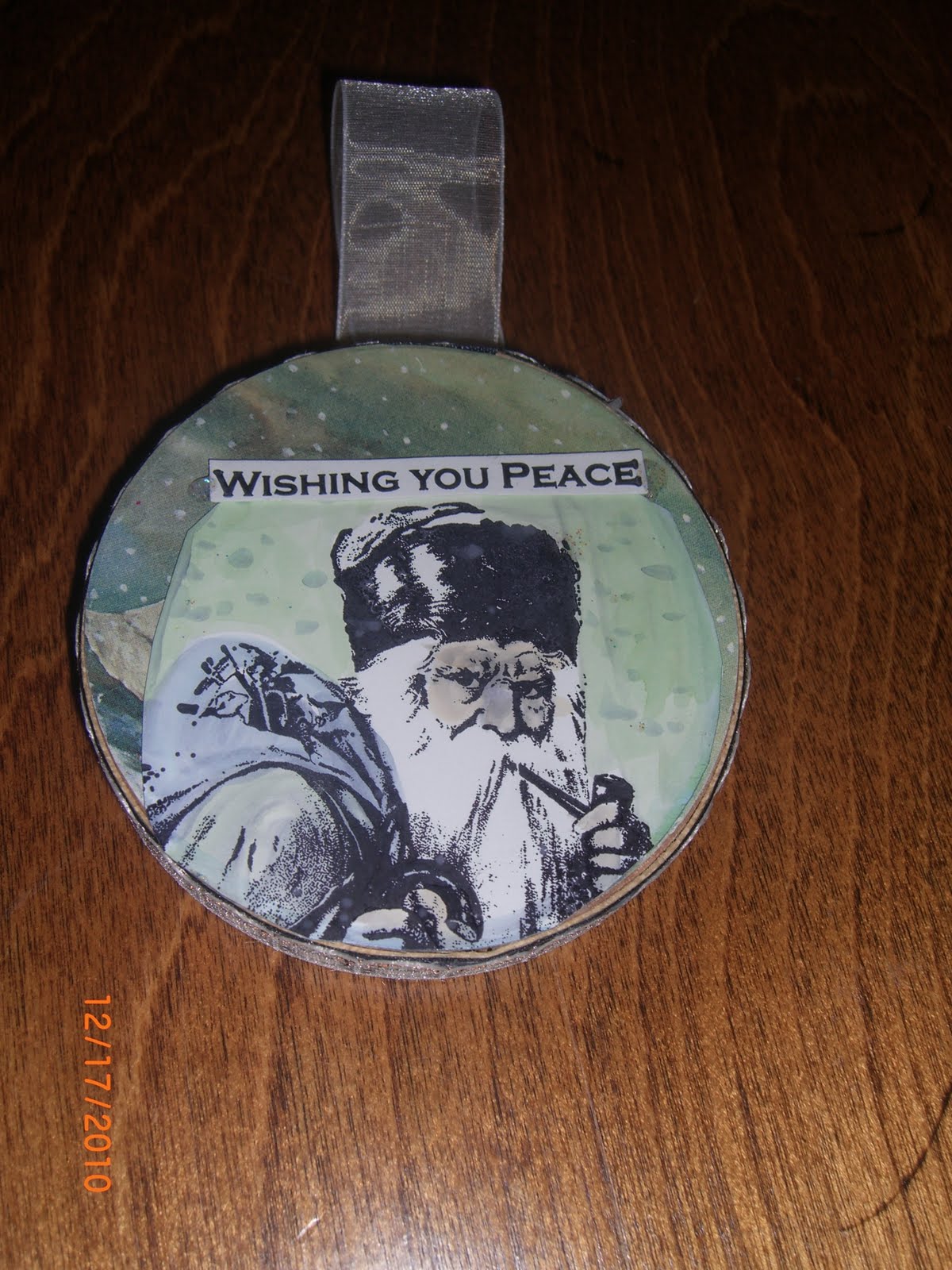 The stamp is Artistic Outpost. I made it to look like a vintage ornament with this great stamp from Artistic Outpost..It has ribbon around the edges and a ribbon for the hook. I colored it with copic markers. I am entering this in the the December Referral Program featuring Home Decor/Ornaments or Holiday related projects.