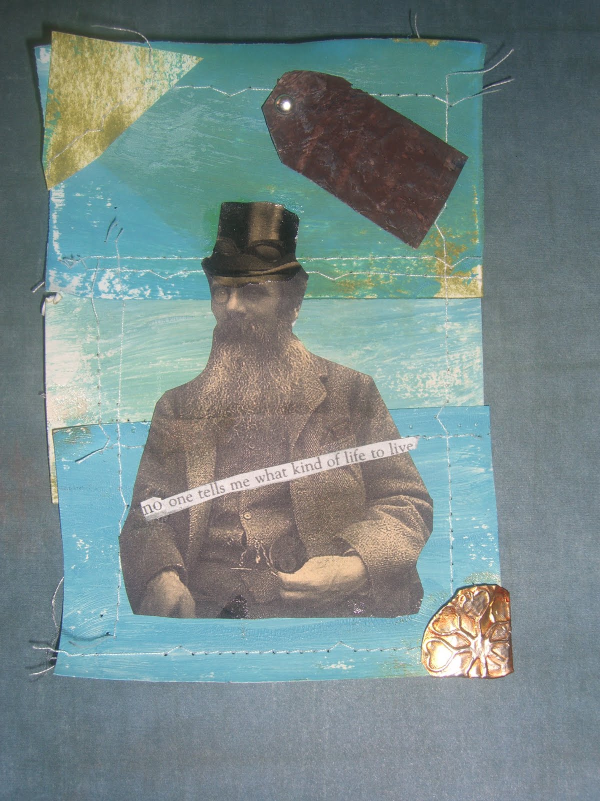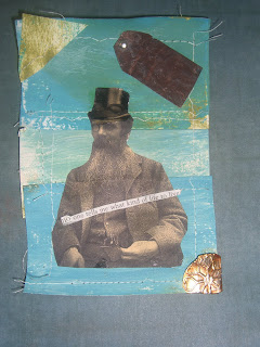 Gingersnaps is have a Color Challenge of Iron, Leather & Brass.  As part of Dezinaword DT, we were able to join in.  Here is my creation, it is a card or journal topper.  It was made with several different pieces of painted pieces then sewed back together, an old gent from Dezinaworld images, a tag from the recycle plastic bag ironed and painted to look all leathery, iron the tags holder and brass in corner, made of tape and colored brass.